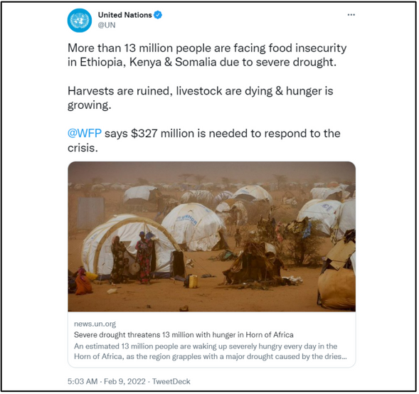 Tweet 9: United Nations Das Horn von Afrika ist von Hunger bedroht. 13 Millionen Menschen in Äthiopien, Somalia und Kenya sollen betroffen sein.