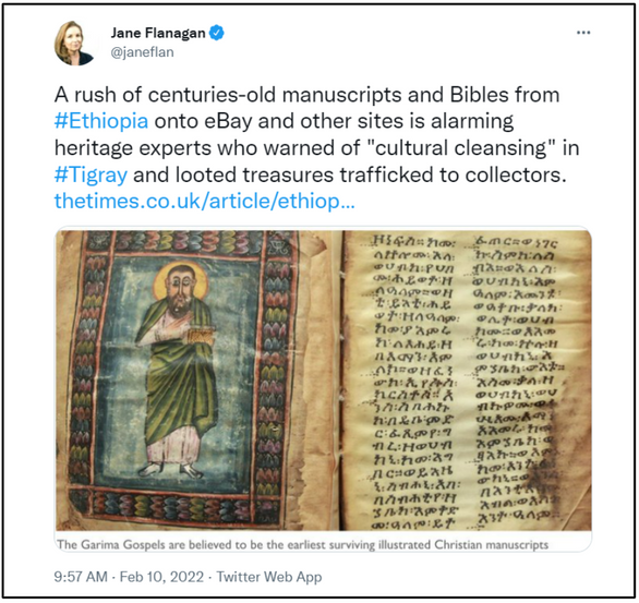 Tweet 5: Jane Flanagan Dieser Tweet handelt von antiken Relikten, die im Krieg gestohlen und nun auf Ebay verkauft worden sein sollen. Hier gehts zum Artikel: https://www.tyms.ch/post/tigray-antike-relikte-illegal-verkauft